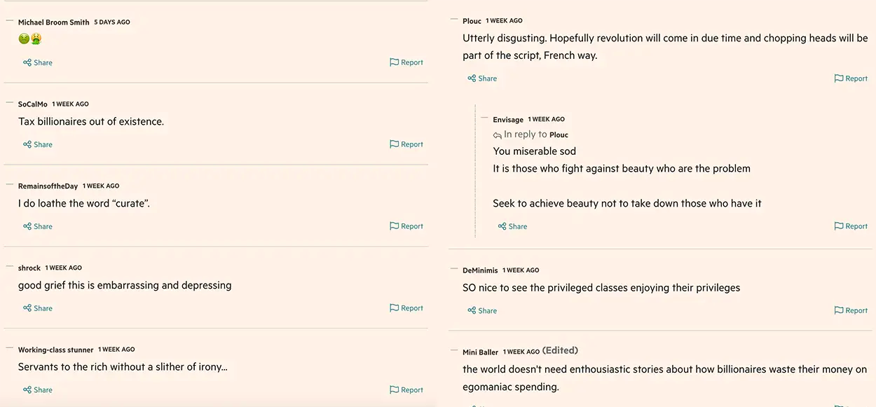 As with the Ken Fulk article above, the comments go OFF, people love a billionaire family target, exorbitantly priced food is a hot topic when some are struggling to eat.