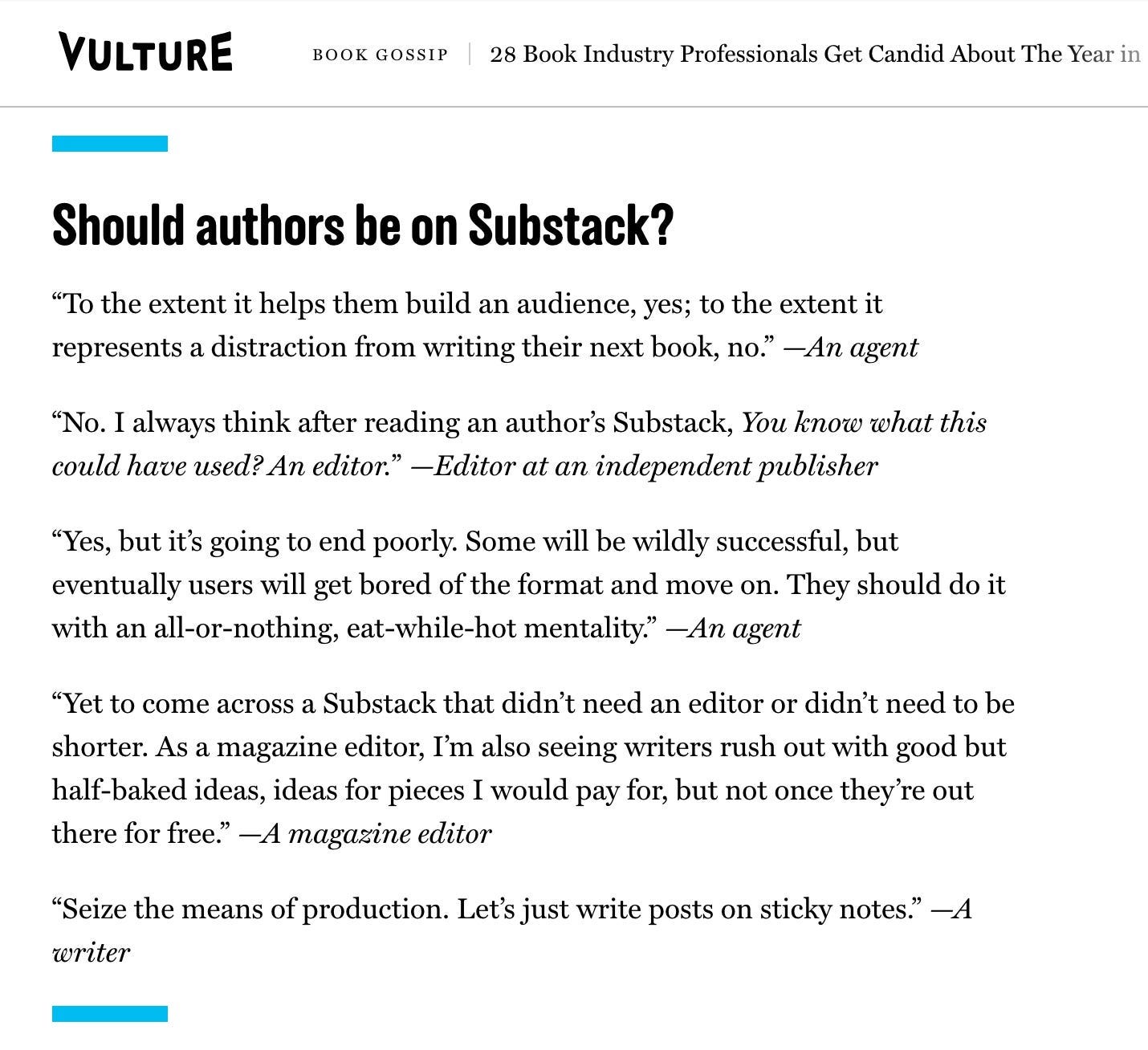 Should authors be on Substack? A short piece on Vulture (which strangely I can’t find online anymore) has sparked a debate which seems to really center on another industry seeing embedded gatekeepers resisting a new medium.