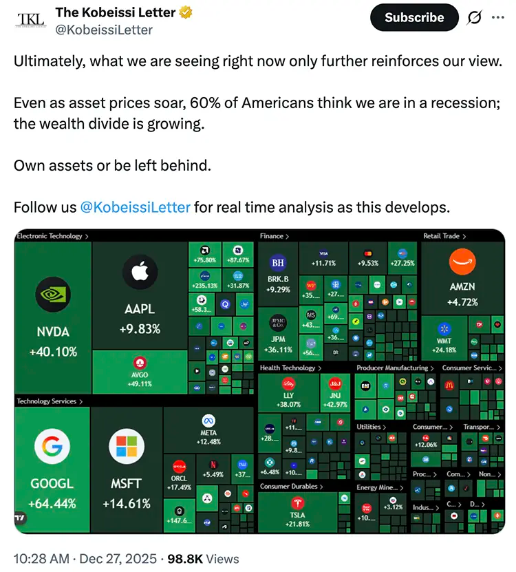 As Kobeassi put it ‘Own assets or get left behind.’ In 2025, If you were invested and stayed the course, even through the early tariff chaos, you’ve done remarkably well.