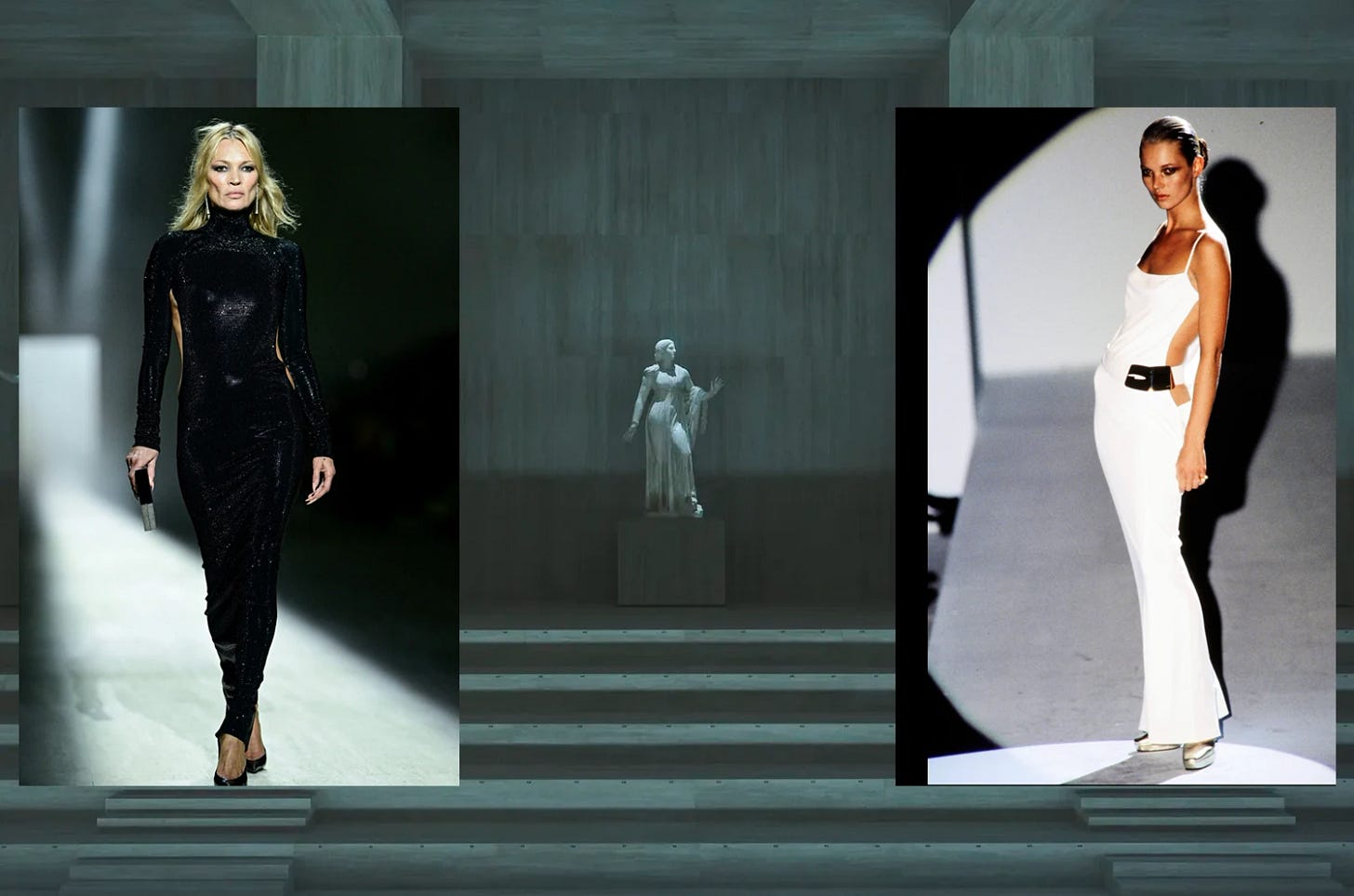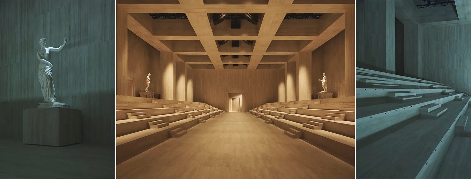 A spartan, marble-clad room, replica sculptures from the Uffizi, and incredible lighting design in this gray blue to amber tonality, take me to Bladerunner 2025 and dune.