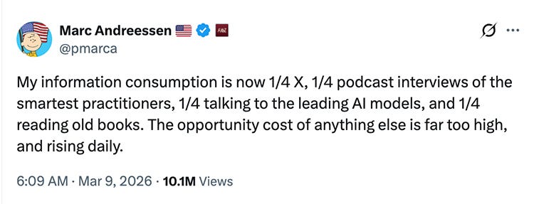 This andreessen comment on his current media diet is spot on. Showing the evolving role of AI in daily workflows, the role podcasts play in todays information flow and the premium on high-value information sources.