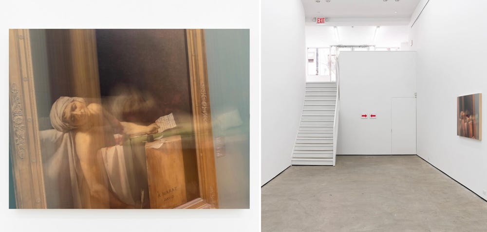 A Timely recontextualization of Jacques-Louis David’s masterpiece The Death of Marat (1793), painted during the French Revolution. A take on political martyrdom in artwork on display at Maxwell Graham’s latest exhibition of works by the artist alongside Hans Haacke.