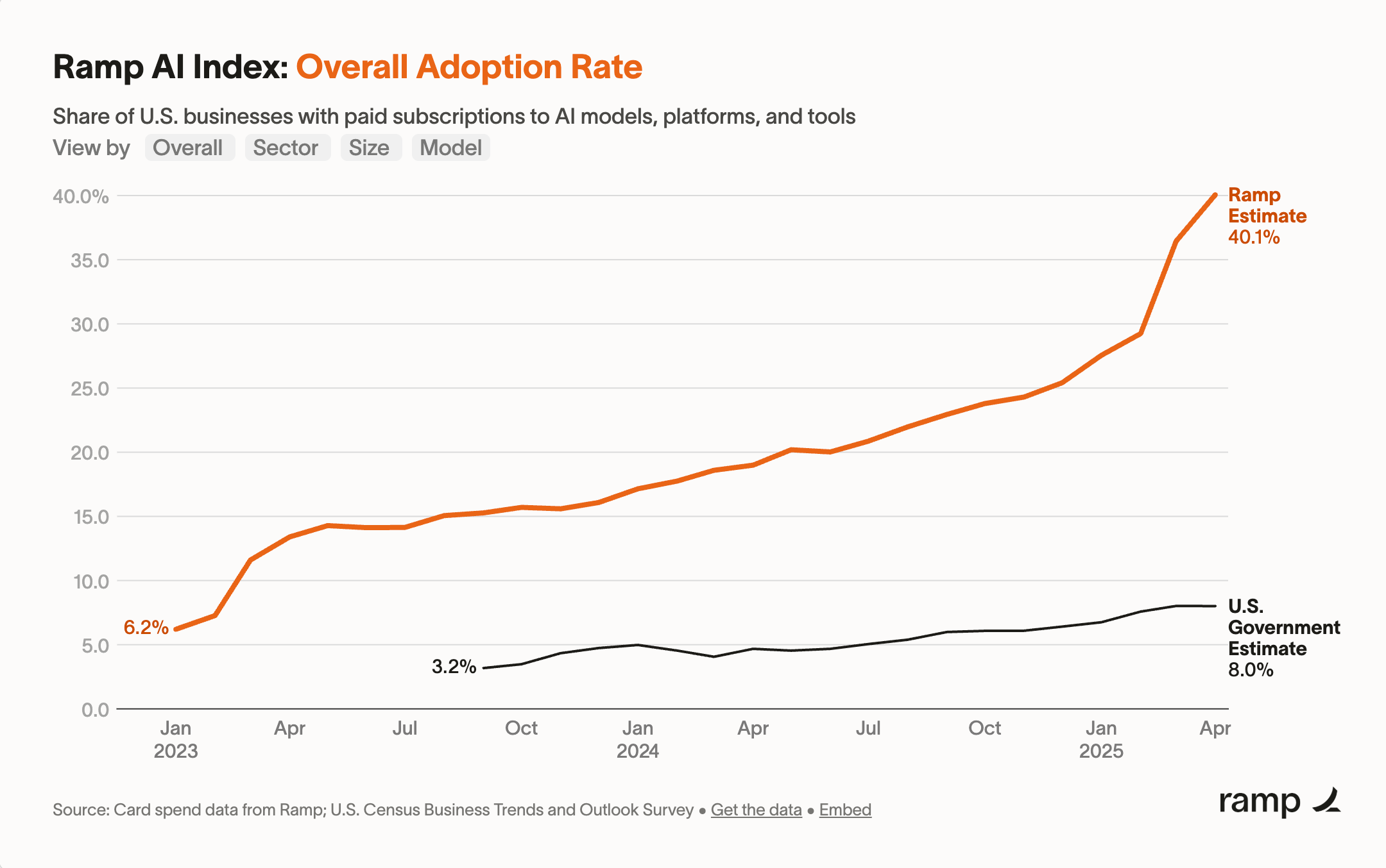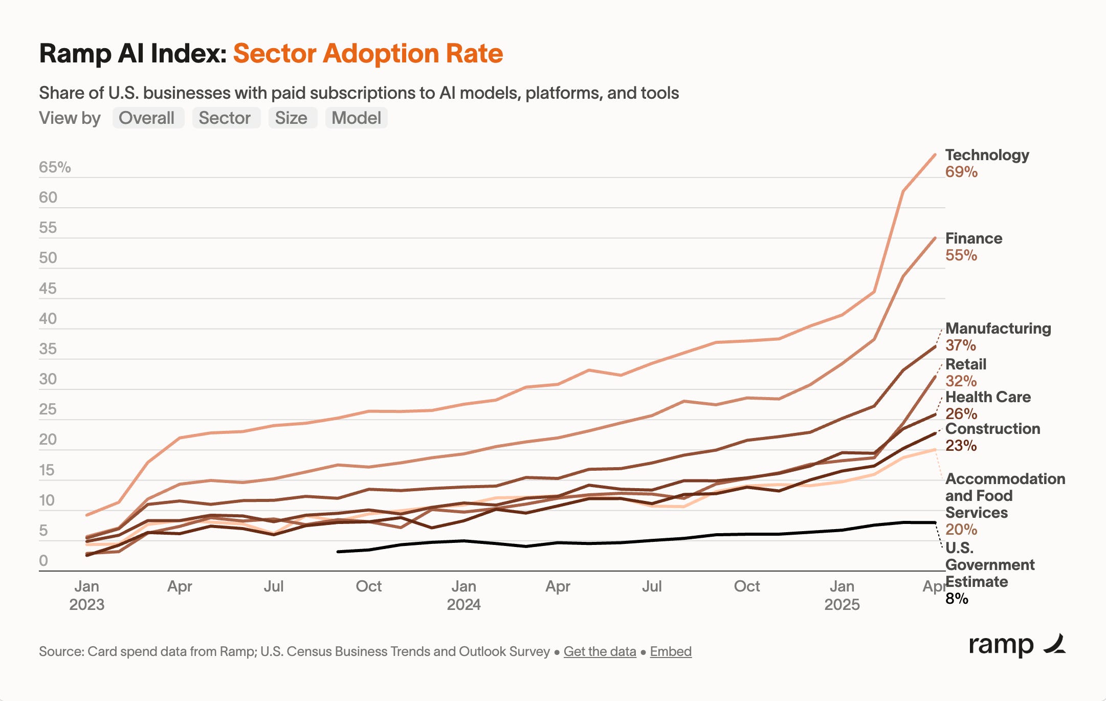 Ramp's AI index has some interesting stats on adoption by sectors, size of business, and what models are most subscribed to. I found it interesting but not surprising how far behind the government is to AI adoption vs the overall landscape. The government is incredibly slow to adapt to new technology; New York's subway is running on 100-year-old analog systems and our Air traffic control is using floppy disks.